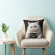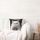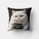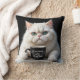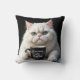 Een pluizige witte Perzische kat met opvallende groen-blauwe ogen houdt een zwarte koffie-mok vast met de tekst: "Ik ben geweldige na de koffie."