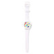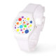 Een vet vlekpatroon met ongelijke regenboogvlekken op wit.