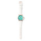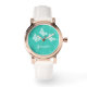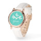 Deze horloge heeft drie mooie witte vlinders op een turquoise achtergrondkleur. Er is ook een aanpasbaar tekstveld voor een naam en de wijzerplaat is gemaakt van stijlvolle witte lijnen.