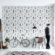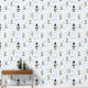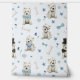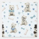 Het ontwerp is voorzien van witte West Highland Terriers met verschillende accessoires in blauw en zwart, zoals tophoeden, brillen, stropdassen, sjaals en botten op een lichtblauwe achtergrond. Show je liefde voor Westies!