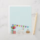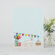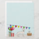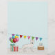 Destei's originele cartoon illustratie van een schattige witte Zwitserse Herder / witte kleur Duitse Herder rashond. De hond wordt geplaatst in een kleurrijke verjaardagssetting. Er is een verjaardagstaart met een aantal kaarsen op, kleurrijke verjaardagsballonnen en een bunting banner, evenals twee cadeaus dozen. De achtergrondkleur is lichtblauw.