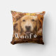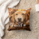 Deze schattige en stijlvolle kussen bevatten twee van je persoonlijke foto's van je hond, samen met het woord "woof" in trendy witte moderne typografie en een pootdruk.