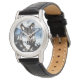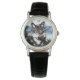 Wolf, of timberwolf, gezicht gelaagd op een besneeuwde berg wildernis achtergrond met de achtergrond die door delen van het wolf gezicht naar creëer een uniek polshorloge toont