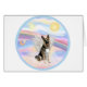 Een Duitse Herder-engel zweeft in de pluizige pastelwolken van de hemel. Personalisatie is beschikbaar via de knop "Aangepast".