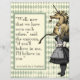 Een ontwerp met gekleurde originele Alice-illustratie en gouden eenhoorn. Het citaat komt uit Alice in Wonderland: door het kijkglas "Nou, nu we elkaar hebben gezien", zei de Unicorn. Als je in me gelooft, geloof ik in jou." Achtergrond van de onderdruk groene harlequin