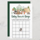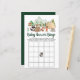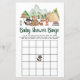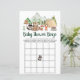 Het kreukelbingspel van het baby shower met een illustratie van bosbouwhuisdieren (een beer, vossen en wasbeer) met hun tententenkamp en kampvuur in de bergen en het bos en "Baby shower Bingo" in een donker jager groen script.