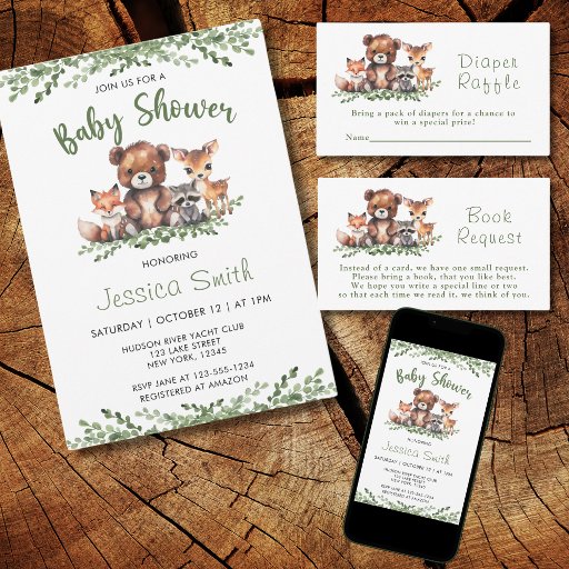 Dit ontwerp is voorzien van schattige bosdieren tegen een achtergrond van weelderig groen en rustieke charme. Ideaal om een kleintje op de wereld te verwelkomen. Pas met uw evenementengegevens aan en creëer een gedenkwaardige start van uw bosavontuur!