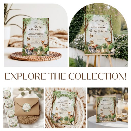 A charming woodland drinks station poster featuring soft watercolor trees and adorable forest animals in a warm storybook setting. The deer, squirrel, raccoon, bunny, hedgehog, and bird add a sweet rustic touch that is perfect for a nature-inspired baby shower celebration. Gentle greenery and earthy tones make this design a beautiful fit for a gender-neutral event and coordinated woodland party decor. A lovely poster for styling your beverage table and inviting guests to help themselves to drinks.