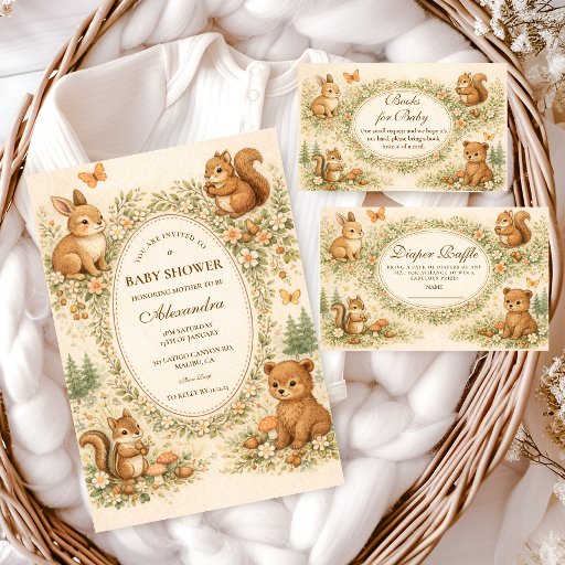 This charming woodland baby shower design features adorable forest animals gathered around a delicate vintage frame, creating a warm storybook scene perfect for celebrating a little one on the way. Sweet illustrations of a bunny, raccoon, squirrel, and owl are surrounded by tiny mushrooms, pinecones, wildflowers, and soft woodland greenery. The warm neutral palette and gentle watercolor style give the design a cozy, nostalgic nursery feel inspired by classic children’s book illustrations. Perfect for nature-themed baby showers, woodland celebrations, or rustic forest gatherings.