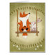 Een vos en een konijn zitten op een boomschommel met schattige kleine grijns op hun gezicht in dit bosrijke afbeelding. Boven en onder de wijnstokken worden wijnstokken als een donkere avocado groene kleur randen en lichter in het midden. Witte wervelingen en paardenbloemonkruid zijn te zien in de hoeken. Origineel ontwerp van Christie Black van Creations from the Heart.