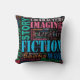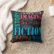 De voorzijde van dit werpen kussen kenmerkt fictie het schrijven woordenschat die in woordkunst wordt geschikt. De veelvoudige kleuren en de doopvonten worden geplaatst tegen een zwarte achtergrond. De achterkant van de kussen is een stevige turkooiskleur. Beschikbaar in de lumbale stijl.