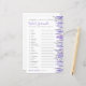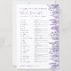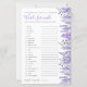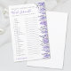 Elegante Waterverf Lavendel Bloemen Vrijgezellenfeest Word Scramble Game. Voeg wat plezier toe aan je vrijgezellenfeest met deze klassieke activiteit waarbij gasten proberen een lijst met huwelijksgerelateerde woorden te ontwarren. Het is een luchtige en interactieve manier om de aanstaande bruid te vieren terwijl iedereen wordt vermaakt. Het ontwerp beschikt over een schattige waterverf lila en lavendeltuin met stengels in een verscheidenheid aan paarse tinten en frisgroene bladeren. De bloemen stromen sierlijk langs de zijkant, waardoor de spelkaart een moderne en grillige touch krijgt. Een mix van klassieke seriële lettertypen en elegante scripttypografie maakt het spel stijlvol maar toch gemakkelijk te lezen. Volledig aanpasbaar, kunt u de versleutelde woorden, lettertypekleuren en achtergrond bewerken om aan te sluiten bij uw vrijgezellenfeest thema. Deze activiteit voegt een lief en speels detail toe aan elke viering.