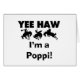 Yee Haw Ik ben een Poppi T-shirts, mokken, kaarten, stickers, aankondigingsknoppen, keepsakes, en andere poppi kleding en geschenken met een buckaroo paard en zwart of wit tekst ontwerp. Deze poppi kleding en cadeau artikelen zijn perfect voor de eerste keer grootouders of doorgewinterde poppi's van een nieuwe aankomst!