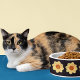 Keramische kom voor voeder voor gezelschapsdieren voor katten of honden met een afbeelding van het afbeelding van een gele Dahlia-bloem tegen een zwarte achtergrond en in een herhalingspatroon gedrukt. Een mooi, bloemetjesontwerp! Selecteer de grootte van de kom van uw huisdier.