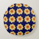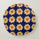 Steek uw huis met deze ronde kussen die het foto-afbeelding van een gele Dahlia-bloem op een blauw marinesolf bevatten en die in een herhalingspatroon worden afgedrukt. Een leuk, floreel ontwerp! Selecteer de stijl van uw kussens.