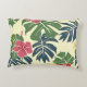 A cheerful red and pink floral pattern with large green and blue monstera leaves against a soft yellow background.