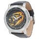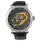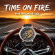This bold watch face prominently features a yellow hot rod car with custom red and black flames painted on its side. The car is depicted on a dark road, with vibrant orange and yellow flames erupting from the ground beside it, resembling fire in grass. Dark, stylized clouds are visible in the background, creating a powerful, intense automotive scene.