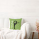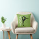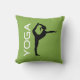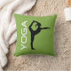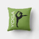 Een kussen met een eenvoudig ontwerp van een zwart silhouet van een vrouw die een yoga-pose uitvoert. Plaats op een groene achtergrond met yoga die in wit wordt geschreven.