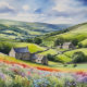 "De hoofdplaats is Yorkshire Meadowsong". Landschap Yorkshire Dales. Deze gestileerde aquarelillustratie van de Yorkshire Dales straalt rust uit, met glooiende heuvels en velden omzoomd door stenen muren. Steenhuizen liggen in het landschap en levendige weidebloemen bieden een kleurrijk contrast, dat de vredige, ontspannen geest van het platteland belichaamt.