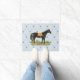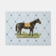 Handachtig zwart paard met zadel in volledige kleur, illustratie op lichtblauw gepatterde achtergrond