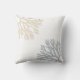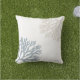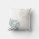 Dit kussen in kuststijl heeft twee zeeen koraalsilhouetten, een in kustblauwe kleur en de andere een zandkleur. Op de achterkant zijn twee zeeen koraalsilhouetten, de ene een lichtere tint blauw en de andere is een bruine kleur.