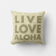 Kaki en Cream Colorway. Live, Love and Aloha is de boodschap op dit ontworpen kussen die terugkeert naar een positieve versie van het Zebra Palm-patroon op de achterkant. Deze eenvoudige grafische palmbladeren waren geïnspireerd op de wuivende palmbomen. Hun eenvoudige strepen herinneren ons aan de patronen op een zebra. Twee kleurpatronen zoals deze werden vaak gebruikt in de patronen van Aloha-shirten en Muu-Muus. Dit komt overeen met andere woninginrichtingsproducten en wordt geleverd in verschillende kleurstellingen.