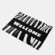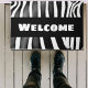 Zebra print met vetgedrukte tekst "Welkom". Funky deurmat in zwart-wit met de originele kunst van Alma Wad. Geweldig in elk modern huis waar retro-stijl items worden gewaardeerd.