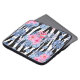Een moderne zwarte en witte zebraplaat bedekt met een tropische roze en blauwe hibiscus en flamingo patroon.