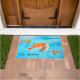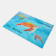 Geïllustreerde zeeen schildpadden deurmat in twee maten. Vermeld "welkomstwoord" en familienaam. Helderblauw water achtergrond afbeelding met kleurrijk schildpaddenontwerp.