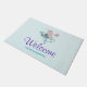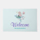 Welkom deurmat met een schattige illustratie. Ontworpen met een zeemeermin meisje rijden op een gelukkige dolfijn. Een kleine kwal vriend vergezelt hen. Versierd met kleine splatters van faux gouden glitter. Lichtblauwe achtergrond met vervaagde roze stippen.