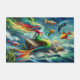 abstracte olieverfschilderde look met een afbeelding van een zeemeermin topicale vin in rood en groen bovenop zitten op een rots met de oceaan en vijf andere kleurrijke topicale vissen en walvissen en zeehonden om haar heen met een blauwe lucht. Groen zeewier drijvend. Dit ontwerp kenmerkt briljante gouden bliksemkleuren en krachtig pose. met verfdruppels op het