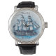 Voor de kapitein van het schip. Verbeter uw persoonlijke kust chique stijl met zeilschip ontwerp. Het zijn meerdere masten en zeilen die door het open zee varen, de tuigage en vlaggen van het schip zijn zichtbaar en het lijkt in beweging te zijn. Stralen komen uit de rechterbovenhoek, die mogelijk de zon voorstelt, en een kompas roos is aangrenzend. Een perfecte mode aanvulling op uw nautische kleding.