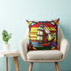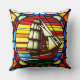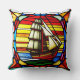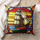 Kleurrijk glas-in-loodkunstwerk met een schip met zeilen op de oceaan tijdens zonsondergang, met nautische thema's in warme en heldere kleuren.