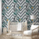 Dit elegante behang heeft een patroon van zigzags en vogels.