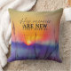 Drog kussen schilderen een prachtige waterverf met een eenvoudige oranje en gele zonsopgang boven een foggy blauw veld. Het bevat een inspirerend citaat: "Zijn genade is elke ochtend nieuw."