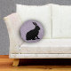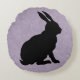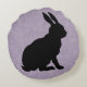Dit ronde accentkussen heeft het zijprofiel van een zittend zwart konijn op een gemarmerde paarse achtergrond aan beide zijden.
