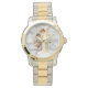 Het ontwerp van dit tweekleurige horloge is van engelen die muziek spelen en zingen op een wolk. Op de achtergrond staat een rol met bladmuziek en schetsen van oude Victoriaans gebouwen achter de wolkenmist. Klik op de knop Aanpassen om tekst toe te voegen.