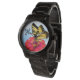 Butterfly op zinnia, natuur geïnspireerd polshorloge. Blauwe lucht achtergrond en zwaluwstaart vlinder eten van een felrode zinnia bloem is het afbeelding met een plaats voor haar voornaam initiaal. Getoond met een zwarte band of kies uit de vele andere kleuren en design. Ideaal voor een vrouwelijke tuinman en / of natuur liefhebber.