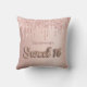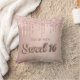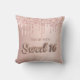 Een kussen voor een 16e meisjeskamer. Een faux roos gouden achtergrond met faux roos goud en roze glitter druppels, verfdruppelend uiterlijk. De tekst: Zoete 16 wordt geschreven met een ballonstijldoopvont, manuscript. Pas een naam aan en voeg deze toe.