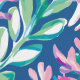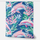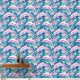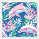 Een naadloos patroon met witte en roze dolfijnen die zwemmen in een blauw zee vol met roze en blauwe mariene planten. Het ontwerp vangt een grillige en levendige onderwaterscène met speelse dolfijnen en kleurrijke waterflora.