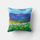 Een decoratief impressionistisch schilderij van een bloemrijke zomerweide en bergen.