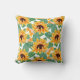 Een kussen met een schattig zomerspatroon. gele zonnebloemen omgeven door groene bladeren in een herhalingspatroon.