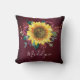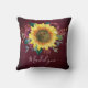 Dit kussen heeft waterverf zonnebloemen en bordeaux rozen met loof en strijklichten. Personaliseer het met een naam of initialen.