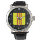 Een internationale stijl met deze op maat ontworpen South Vietnam Coat of Arms Wristwatch. Het gezicht van het horloge heeft het wapen van Zuid-Vietnam op zwarte achtergrond. Het uiterlijk is zeer schoon en elegant. Pas het horloge aan zoals je wilt en veel plezier! Dit is een fantastisch cadeau voor een vriend, familielid of voor jezelf. Ga voor meer gelijkaardige objecten naar: www.zazzle.com/azorean* #southvietnameatch. #vietnam #genealogy. #vietnamhistory #vietnameseaccessories