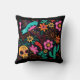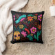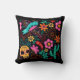 Kleurrijk decoratief kussen met een Mexicaanse stijl, met paprika's, cactus, schedel, vogels, bloemen op een zwarte achtergrond.