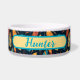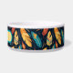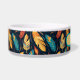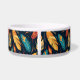 Felle en kleurrijke Zuidwesten, hondenkom in inheemse Amerikaanse stijl met turquoise blauwe, oranje, gele en roestkleurige veren tegen een zwarte achtergrond. In het midden is een perzik-kleurige banner waar je de naam van je hond kunt personaliseren.