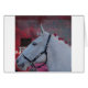 Het hoofd van een zuiver wit paard met een zwarte en zilveren briel en rode bloemen op zijn mane. Dit paard heeft waarschuwingsoren en lange sneeuwwitte wimpers