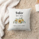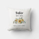 Dit kussen speciaal voor je zus is voorzien van een stijlvolle scripttypografie en een stijlvol bloemboeket van goudgele zonnebloemen met groene bladeren. Voeg het jaar toe dat ze voor het eerst een zus werd, en alle namen van de broers en zussen voor een mooie aandenken die ze zal koesteren. De achterkant van het kussen heeft een bijpassend zonnebloempatroon.