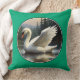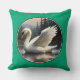 Een sierlijke zwaan met uitgestrekte vleugels glijdt over een sereen waterlichaam omringd door weelderige pijnbomen. De bergachtige achtergrond en zachte reflectie in het water creëer een rustige en harmonieuze scène.