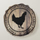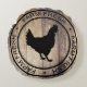 Robuust huisstijl etiket met lichte houtwaren achtergrond met een zwart rond label badge gezegde "boerderij vers". Het centrum heeft een zwarte kipsilhouet.